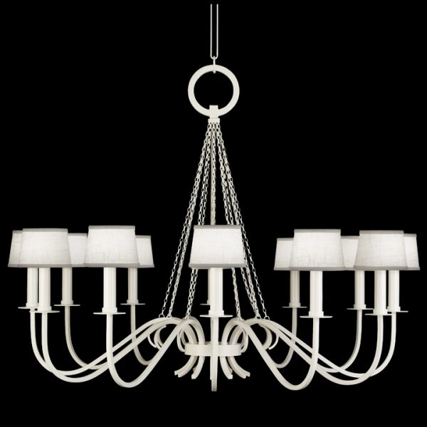 Chandelier in a studio white satin lacquer finish with a hand-tailored white texured linen shade. Also available in a black satin finish #420840-6.