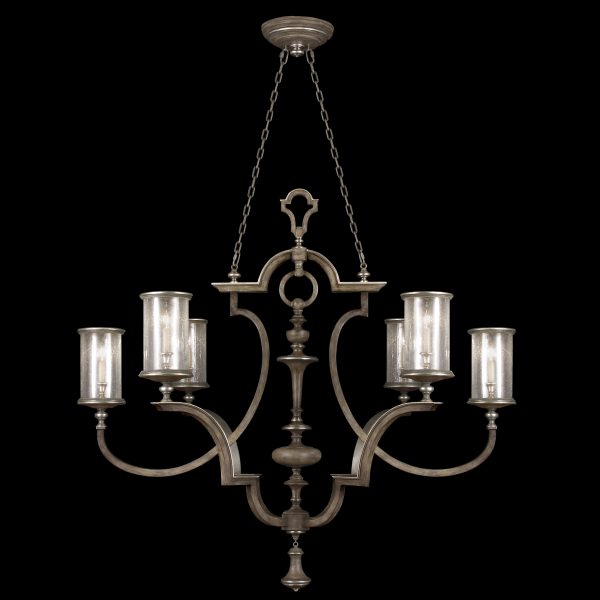 Oblong chandelierin hand painted driftwood finish on metal with silver leafed accents and hand-blown seedy glass shades.